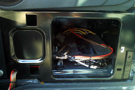 Volle Integration des Verstärkers sowie kleinem Subwoofergehäuse in der Konsole eines Mercedes Vito.